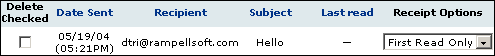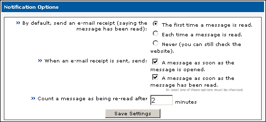 Click Email Notification to access the page where you control your Return Receipt email settings. Click here for more information on Email Notification.